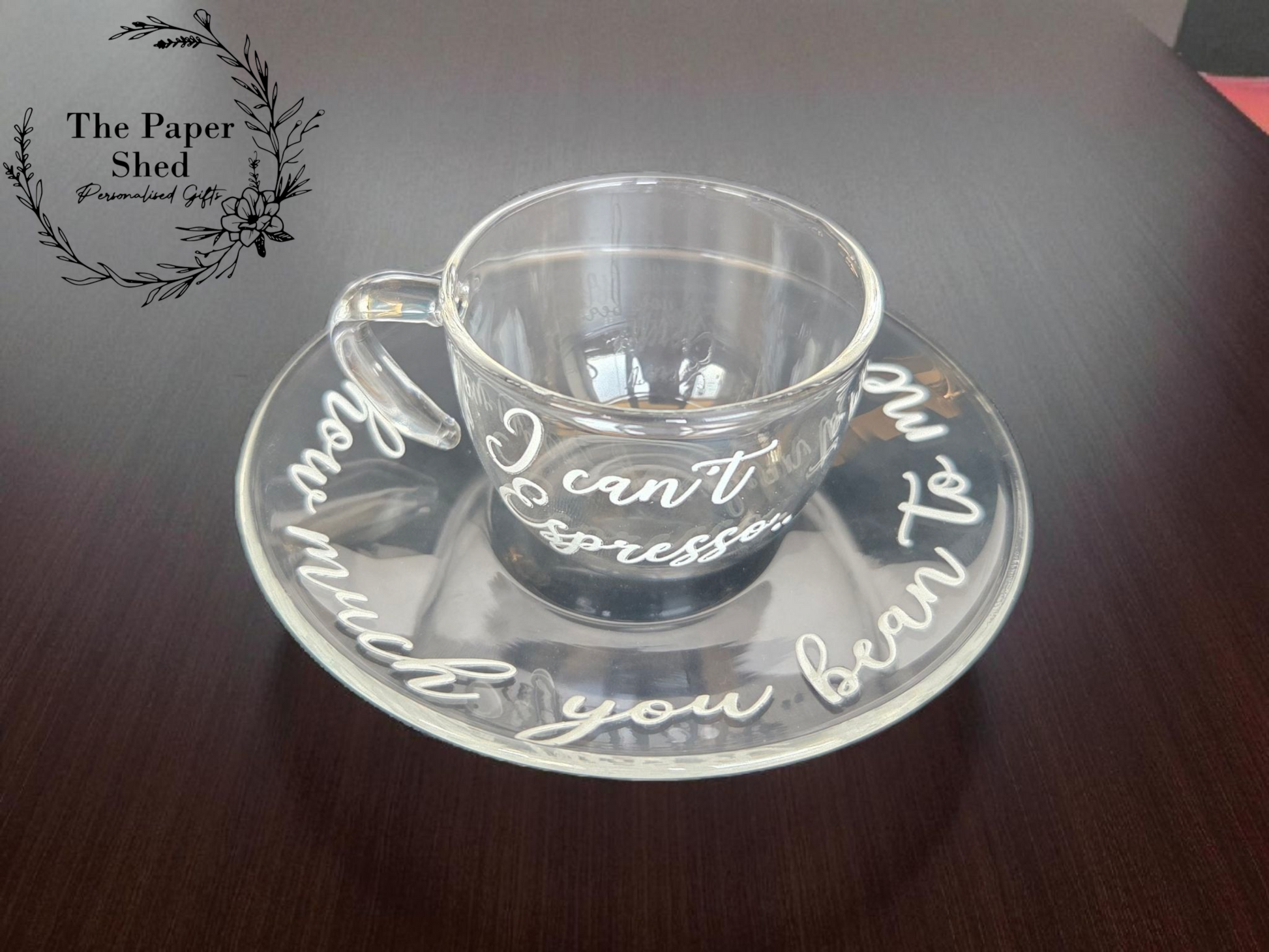 Espresso shot Glasses and saucers Set of 2 'I can't espresso...how much you bean to me'