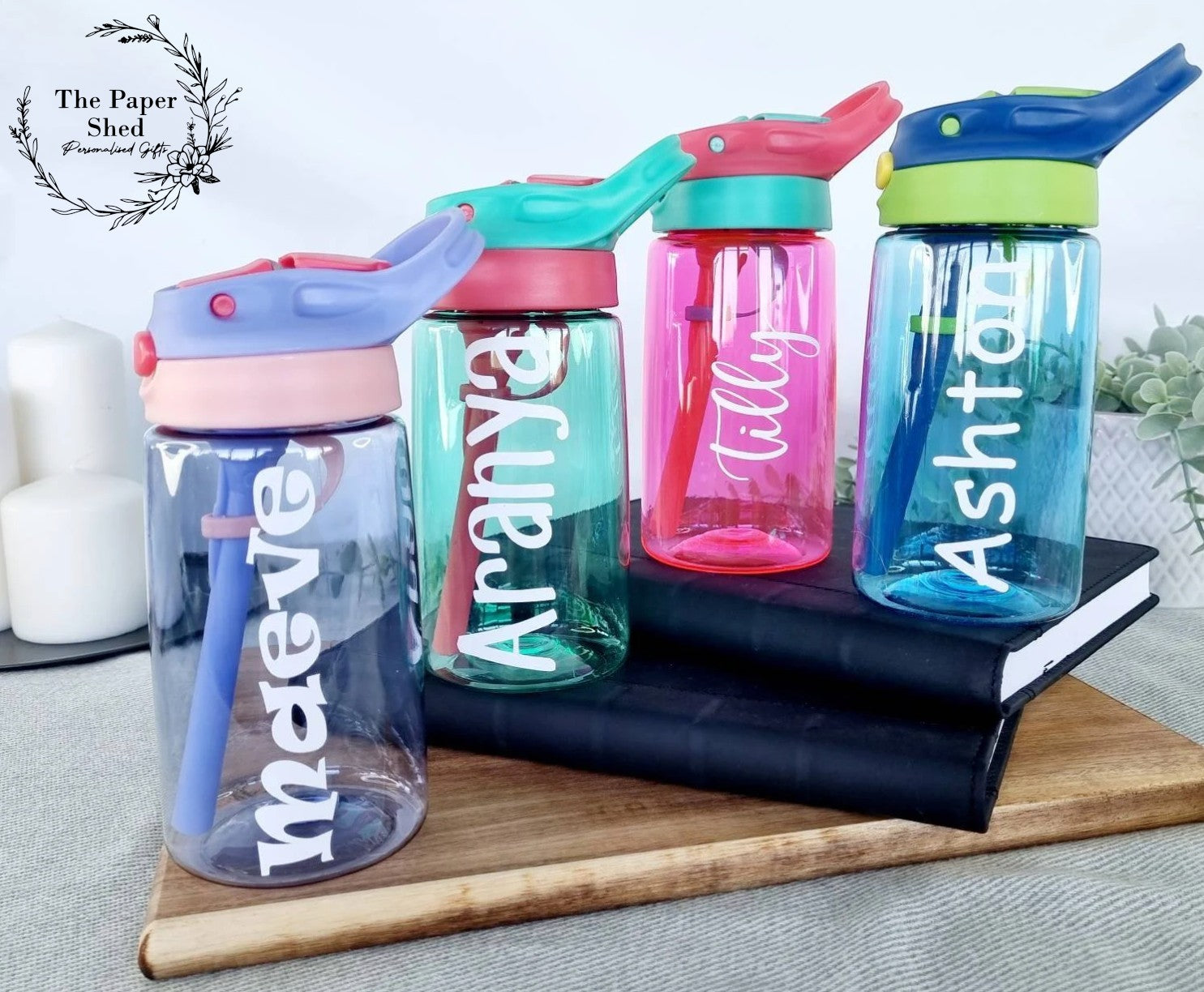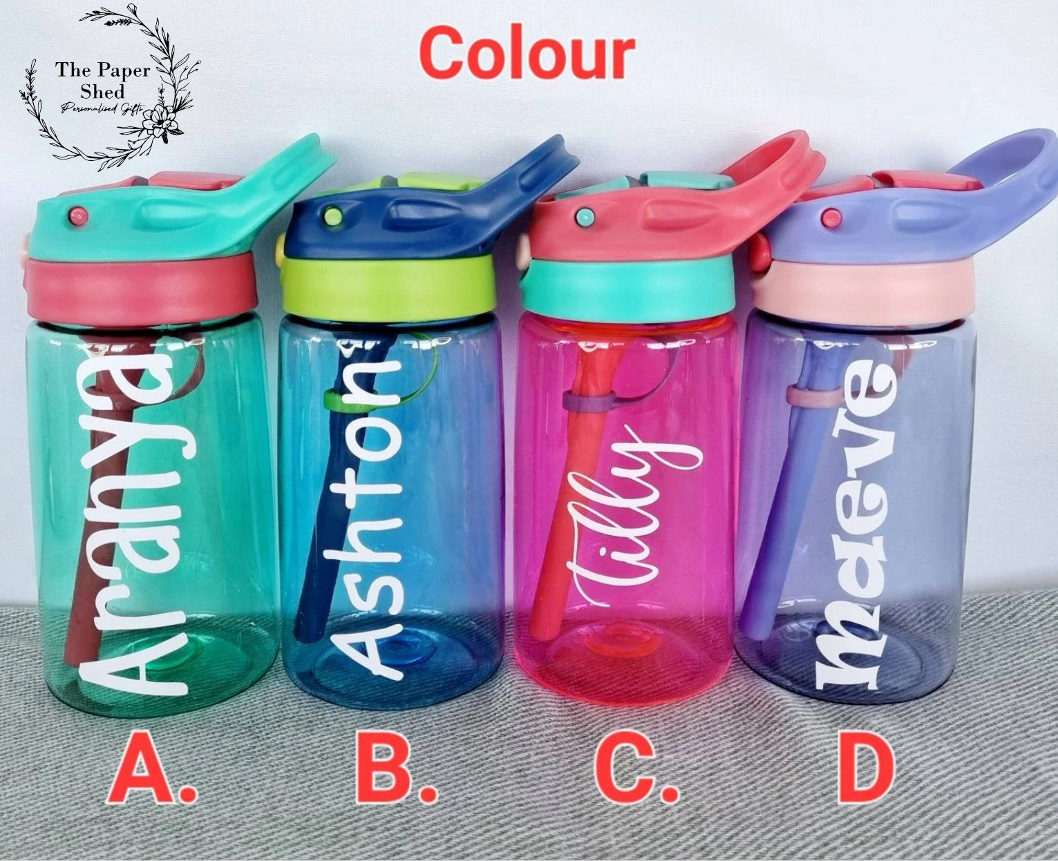 Etsy Bestseller for Children's Drinkware -400ml capacity -Lock away straw -Easy grip lid -Perfect for children from 2+ -BPA FREE There are multiple colours and font options to choose from. The font is a permanent UV printed decal and they colour can be changed upon request. These bottles are hand wash only. Please refer to the letter and numbered pictures when selecting your font style and bottle colour. The longer the personalisation the smaller the font may become.