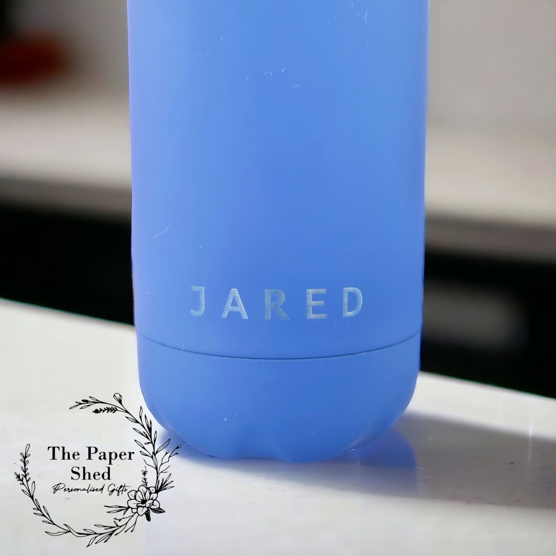 Please note: The engraving will be the base metal colour of the bottle which is usually grey, silver however some bottles are different, the teal would be a metallic green and the orange is a copper, Navy Blue engraves with a metallic blue, light grey has a subtle light grey engraving.