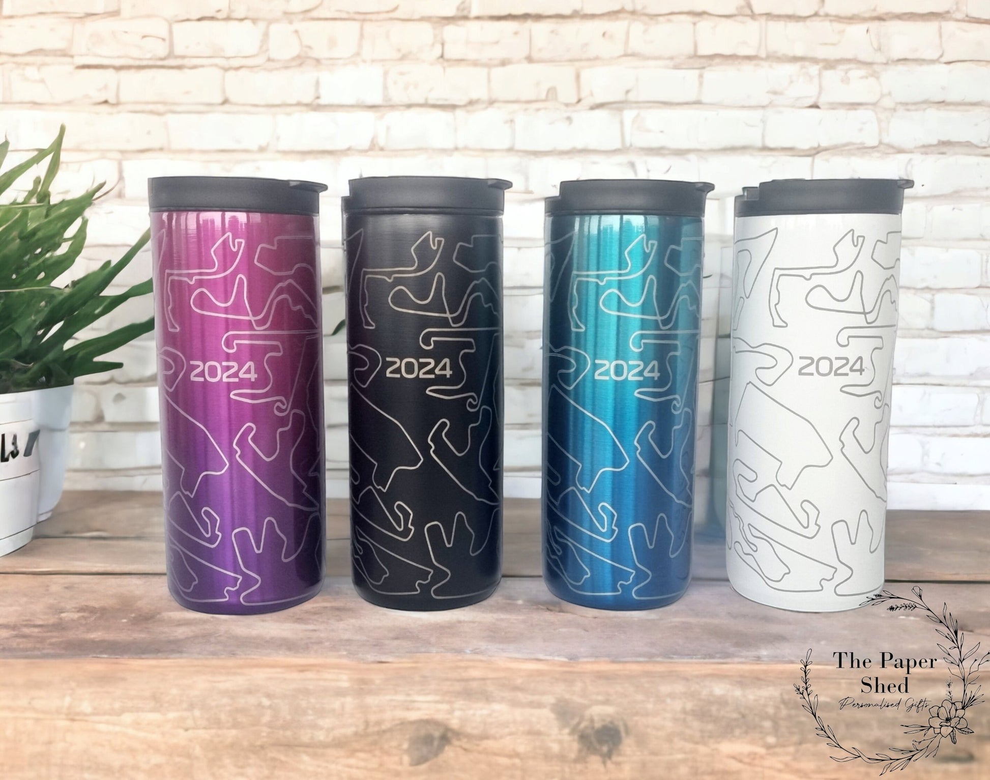 They are approximately 500ml and suitable for hot and cold drinks. Contains all the tracks from the 2025 or 2026 season. Laser Engraved. These are hand wash only.