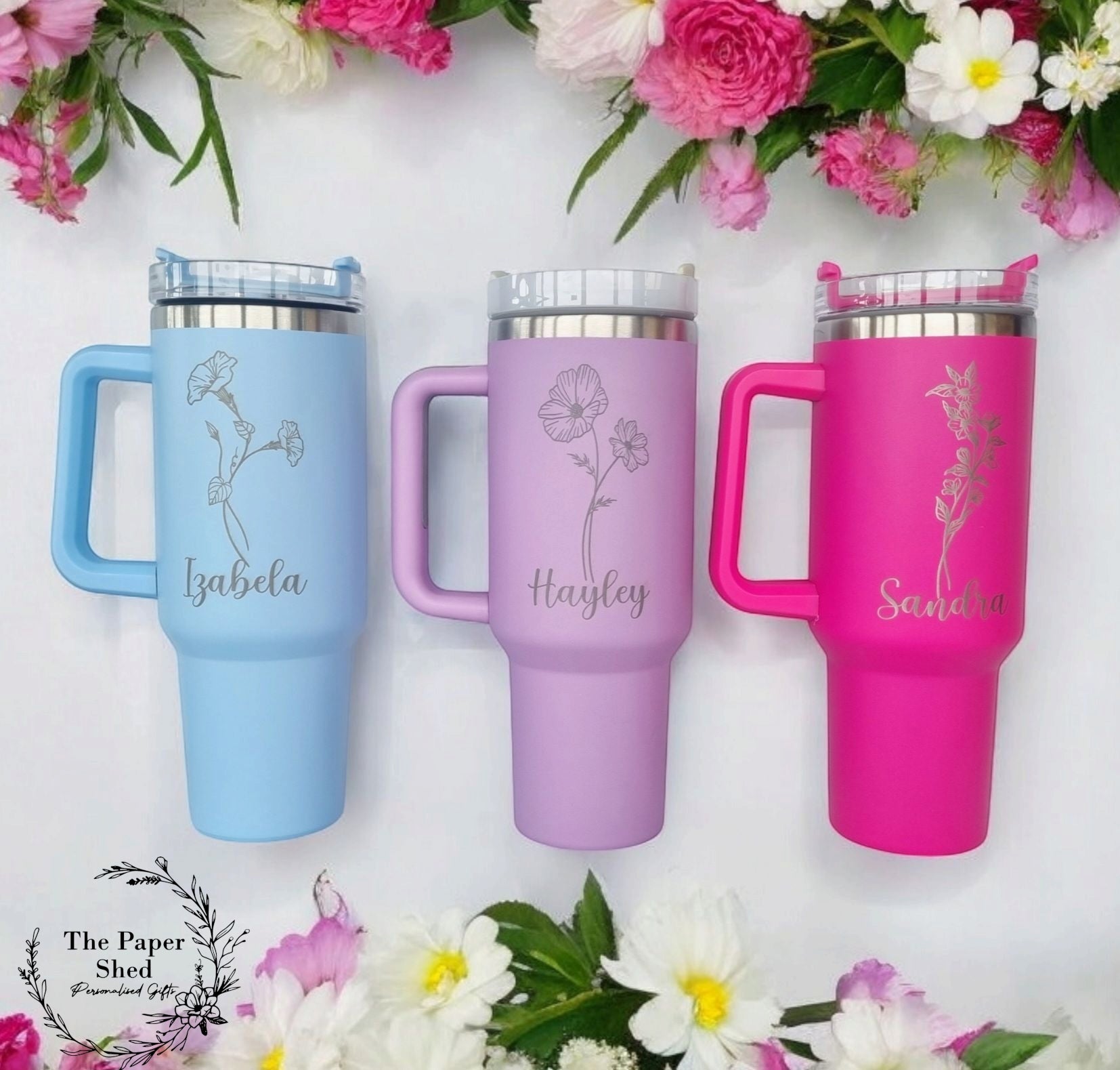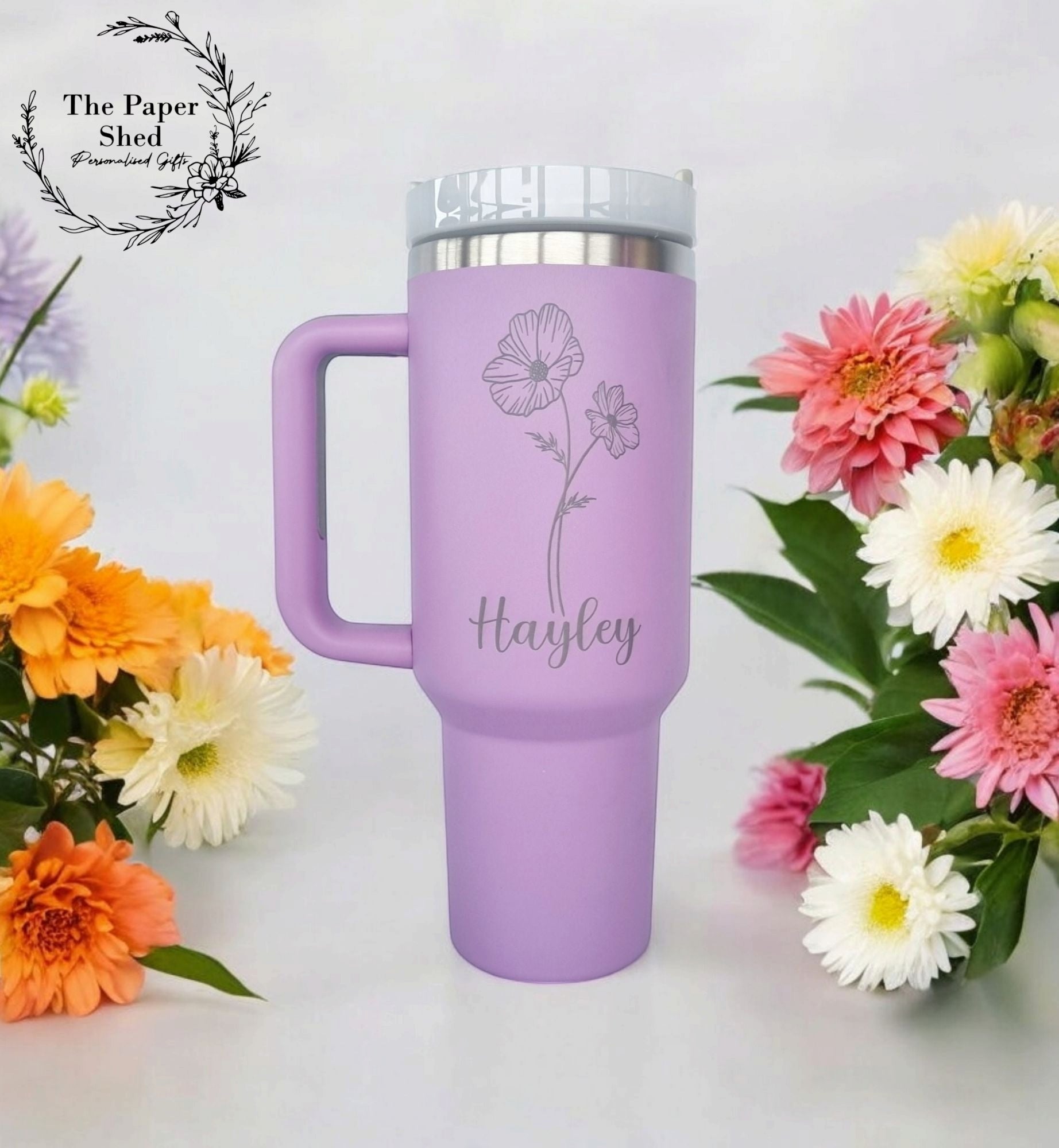 Personalised Birth Flower Engraved Name Thermal Bottle Teacher Gift
