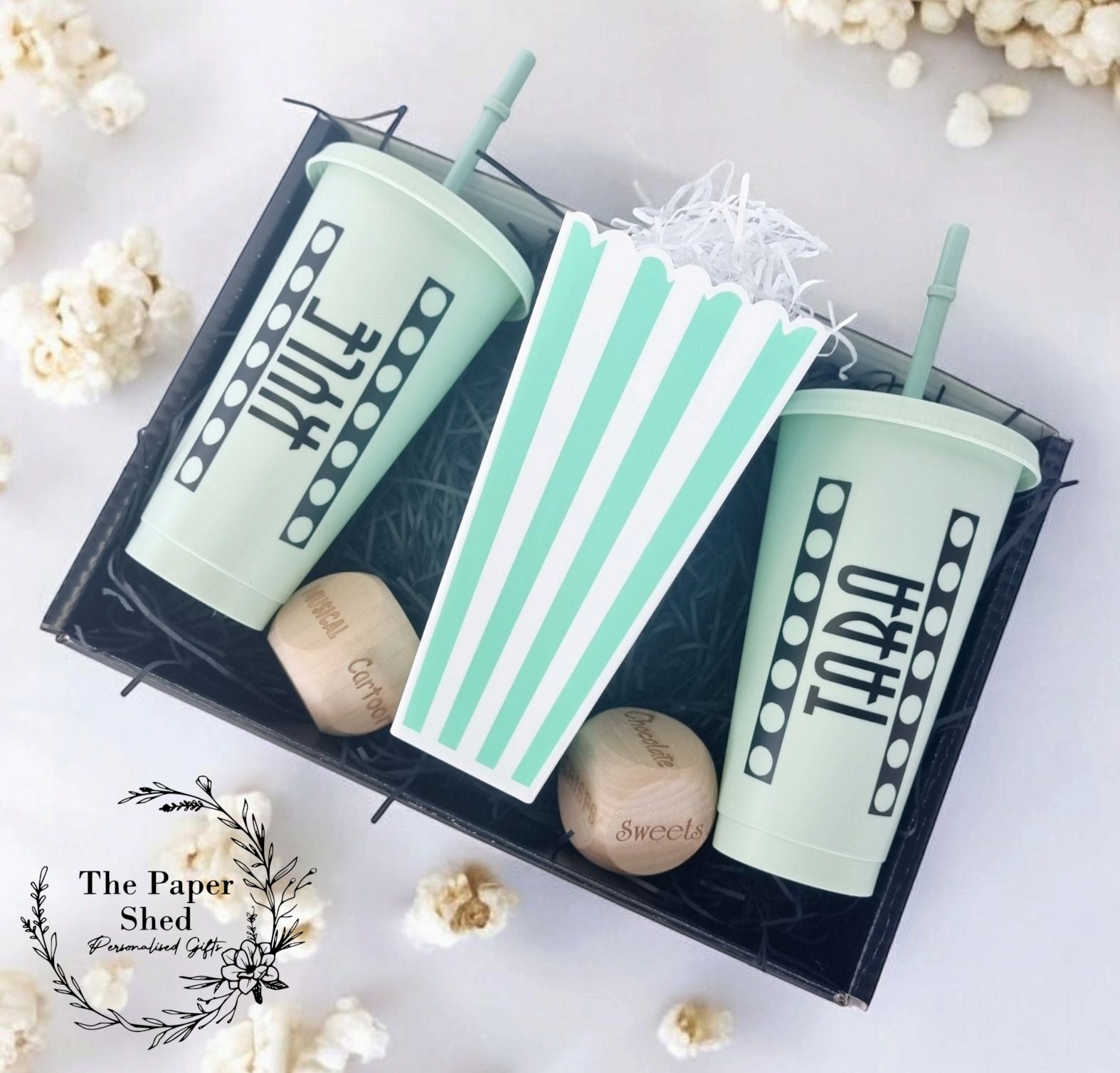 Personalised Movie/Film night / date night/ hamper, box, popcorn, name, cinema, tumbler, drink, cup, dice, couple gift, birthday, dice