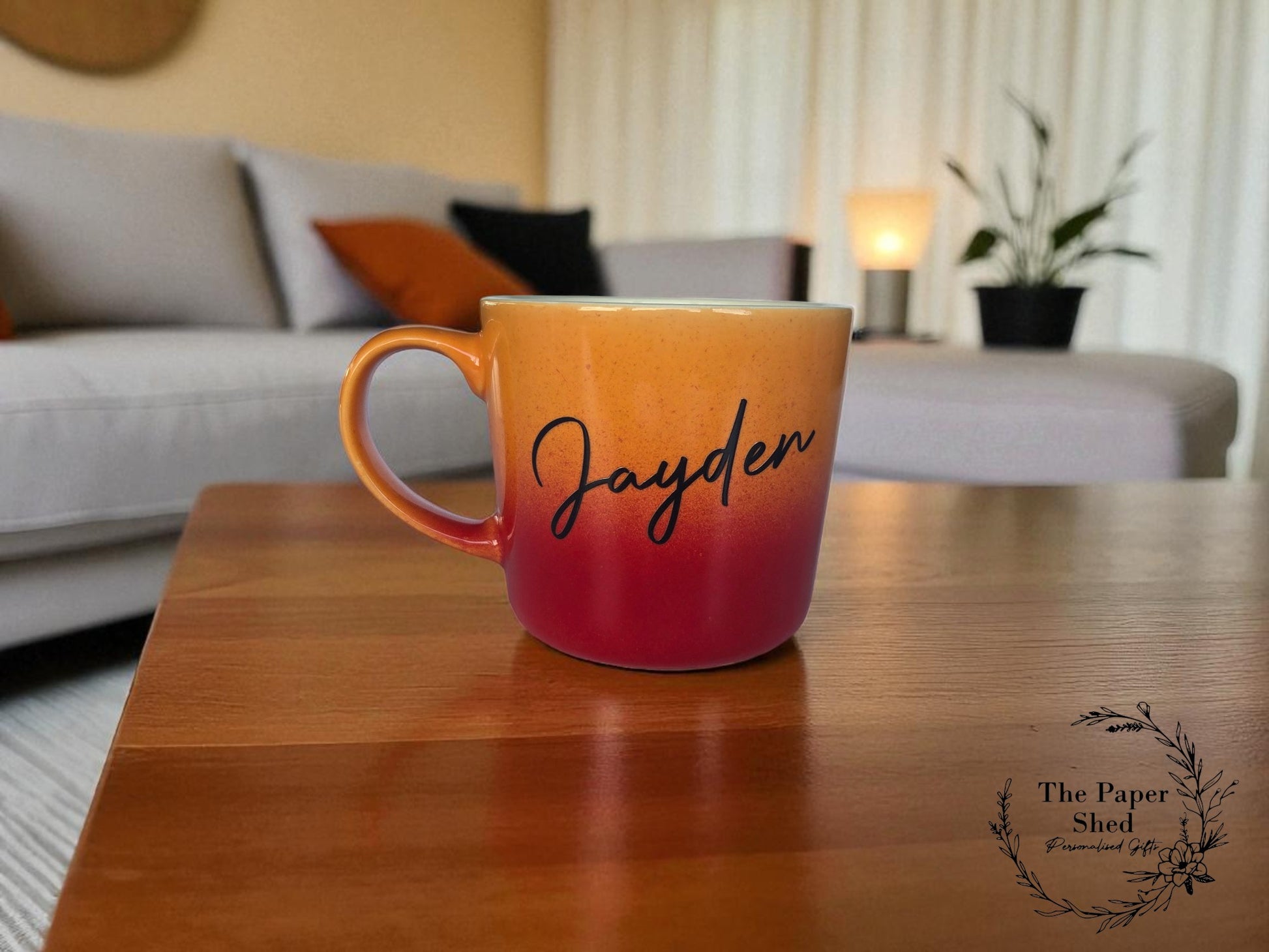 This mug will come personalised with permanent UV printed lettering. The longer the name the smaller the text may become.