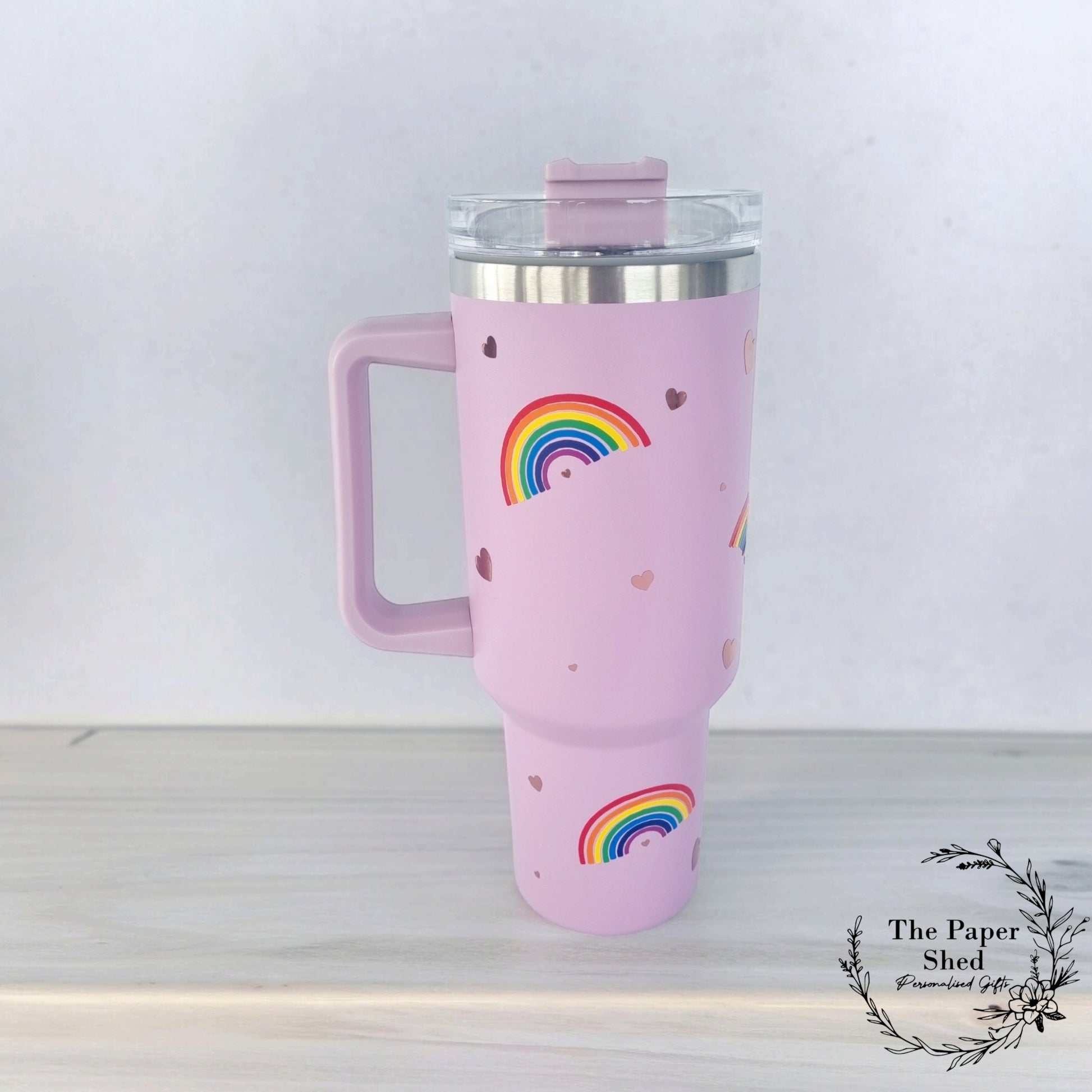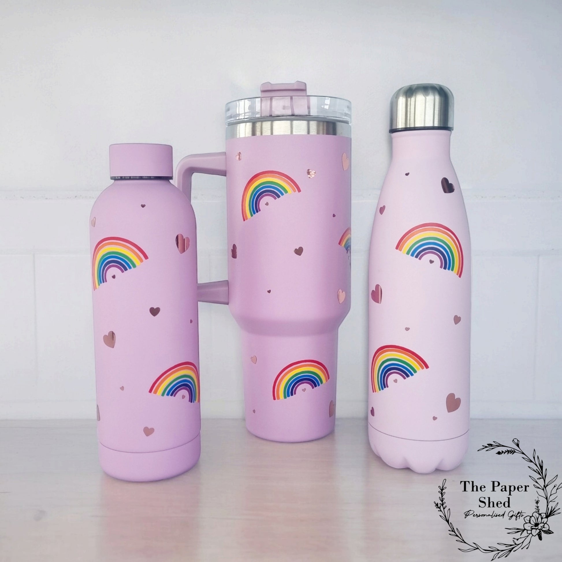 The Rainbow and Hearts Drinkware Collection -permanent UV printed designs - Hand Wash Only-Items sold individually - 40 oz Cup -Straw and lid included -Always keep upright! -Thermal bottles- Hot up to 12 hours, cold up to 8 Please note: If you would like a different coloured cup/bottle please message us.